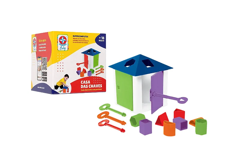Contém na Embalagem: 1 Caixa Encaixa, 6 chaves de cores diferentes, 18 peças de encaixe coloridas e adesivo.